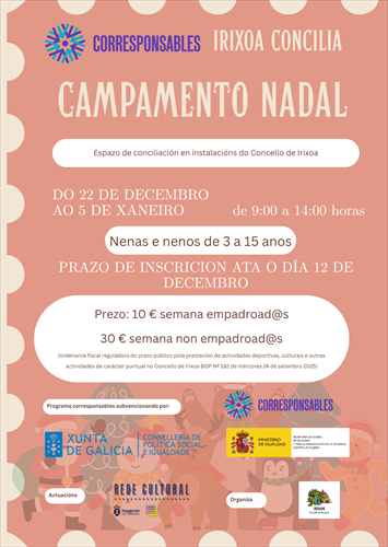 Campamento de NadalO Concello de Irixoa oferta dentro do Plan Corresponsables (Irixoa concilia), subvencionado polo Ministerio de Igualdade, a través da Consellería de Politica Social e Igualdade, un espazo de coidado de menores de 3 a 15 anos coa contratación de profesionais do sector dos coidados, no polideportivo e Biblioteca Municipal.